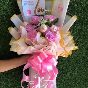 Rangkaian hand bouquet cantik ini diberikan kepada seseorang sebagai kado ucapan selamat ulang tahun.