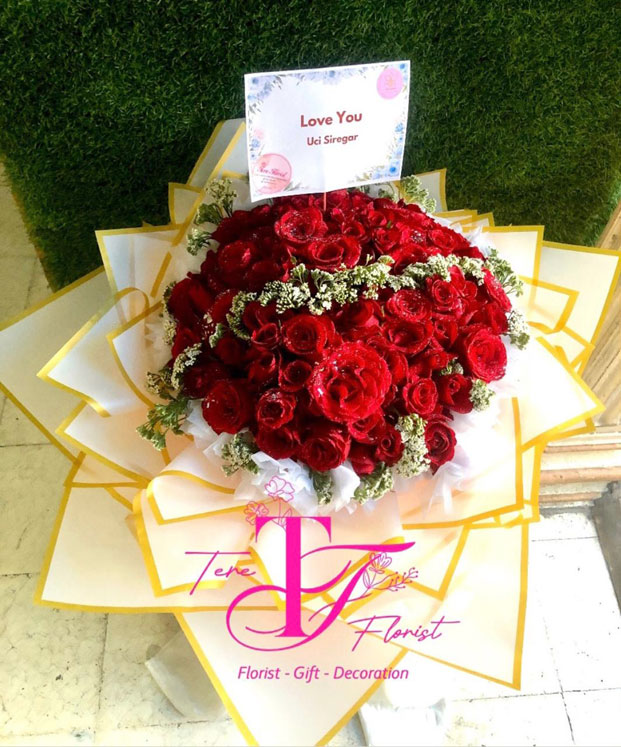 - Menggunakan bahan bunga segar jenis mawar merah 100 kuntum