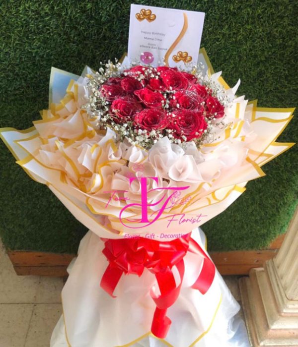 Rangkaian bunga buket cantik ini diberikan kepada seseorang sebagai kado ucapan selamat ulang tahun (happy birthday)