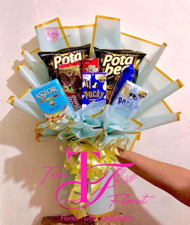 Buket snack ini merupakan buket yang dirangkai dengan berisi beragam jenis makanan ringan, misalnya coklat dan jajanan lainnya.  Snack – snack tersebut diatur sedemikan rupa sehingga kelihatan cantik dan menarik. Dipadu dengan wrapping dan pita berbagai warna menjadikannya cocok diberikan kepada seseorang saat acara tertentu.