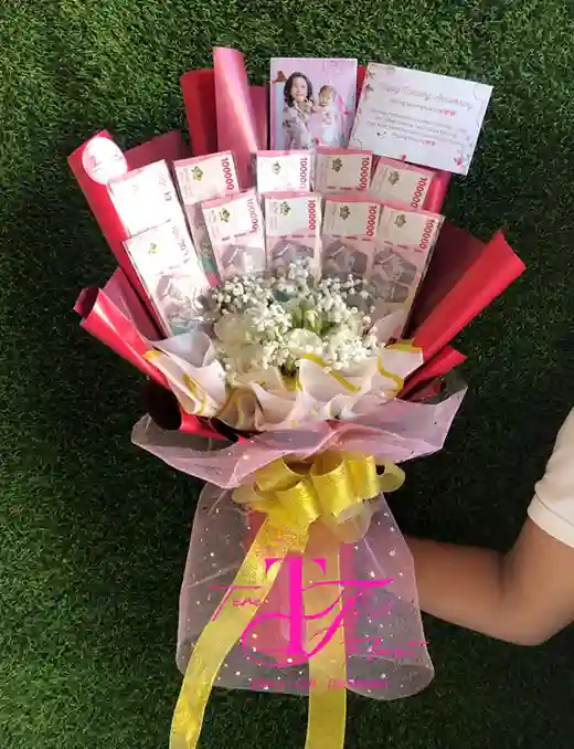 Rangkaian buket uang ini disampaikan kepada suami atau istri saat merayakan ulang tahun pernikahan (wedding anniversary) sebagai kado atau hadiah yang unik.