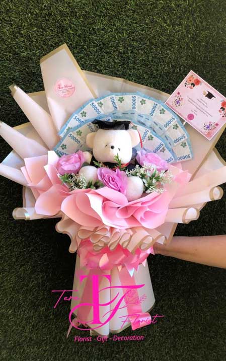 Rangkaian buket uang ini menggunakan uang kertas pecahan 50 ribu terbaru sebanyak 15 lembar. Dipadu dengan bunga artificial, wrapping warna pink, pita warna pink, boneka dan kartu ucapan. Buket uang ini cocok diberikan kepada seseorang yang dicintai sebagai kado saat acara bahagia, misalnya ulang tahun dan wisuda.