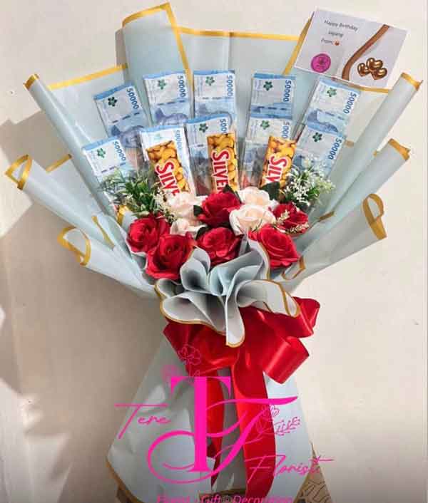 Buket uang ini dirangkai dengan menggunakan uang kertas terbaru pecahan 50 ribu sebanyak 10 lembar. Lembaran – lembaran uang tersebut disusun cantik seperti model kipas yang dipadu dengan bunga artificial, wrapping warna biru, pita warna pink, coklat Silverqueen 3 buah dan kartu ucapan. Buket ini cocok diberikan kepada seseorang saat acara sukacita.