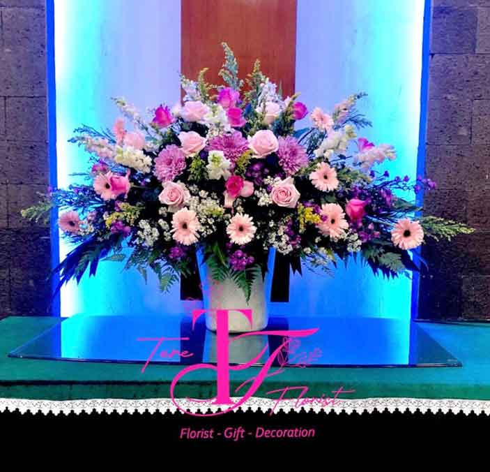 rangkaian bunga meja altar di gereja dengan paduan bunga segar berbagai jenis