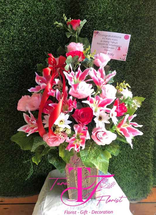 Rangkaian bunga meja untuk ucapan selamat kepada seseorang atau perusahaan dengan bahan bunga tiruan