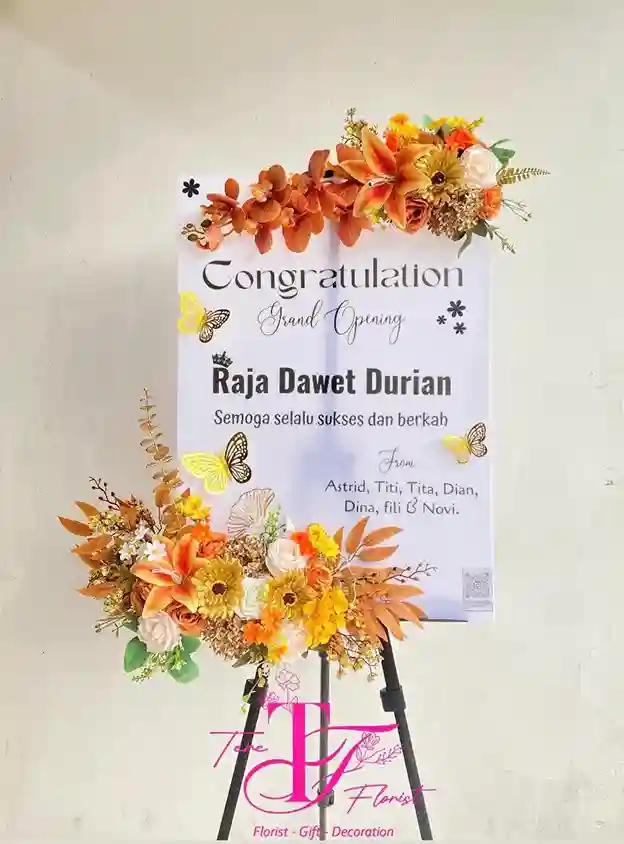 Karangan bunga papan akrilik ini diberikan sebagai bentuk ucapan selamat (congratulations) atas pembukaan atau peresmian suatu usaha baru (grand opening).