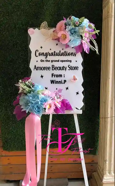 karangan bunga papan akrilik ucapan selamat atas pembukaan usaha baru