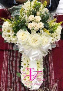 Karangan bunga salib ungkapan turut berdukacita ini menggunakan bahan bunga segar berbagai jenis seperti bunga krisan putih, mawar putih atau kuning, padi-padi dan yang lainnya. Dipadukan dengan daun ruskus hijau segar dan pita warna putih. Karangan bunga ini disampaikan saat seseorang telah meninggal dunia, diantarkan ke rumah duka atau balai persemayaman dan akan dibawa ke pemakaman.