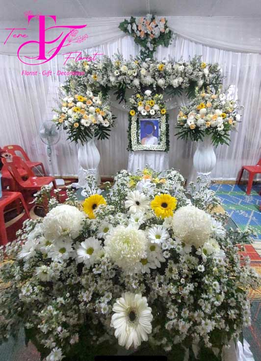 Kami menerima jasa dekorasi ruangan saat acara dukacita di kota Medan dan sekitarnya. Ruangan akan didekor dengan konsep atau nuansa duka dengan pengaturan bunga segar yang ditata dengan baik. Umumnya dekor dilakukan di balai persemayaman atau rumah duka langsung.