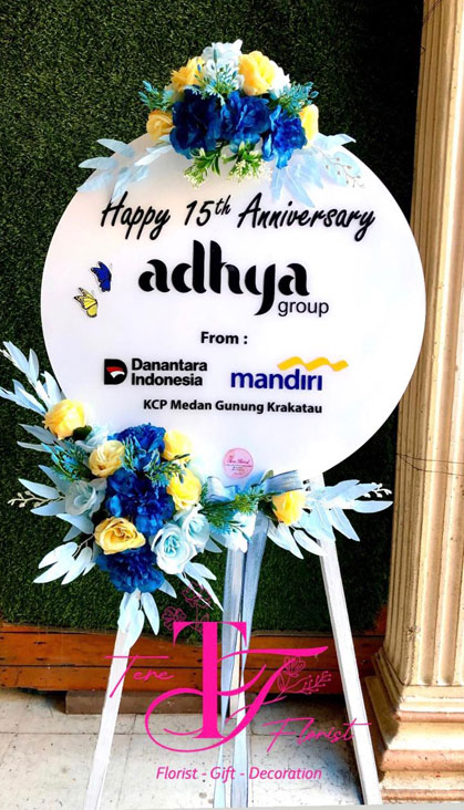 Karangan bunga papan akrilik ini diberikan sebagai bentuk ucapan selamat hari jadi (happy anniversary) suatu usaha