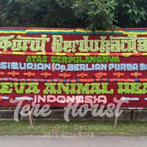 Kalimat ucapan di atas papan umumnya “Turut Berdukacita“. Selanjutnya diikuti dengan nama yang meninggal dunia serta di bagian bawah tertera nama atau identitas pengirim karangan.