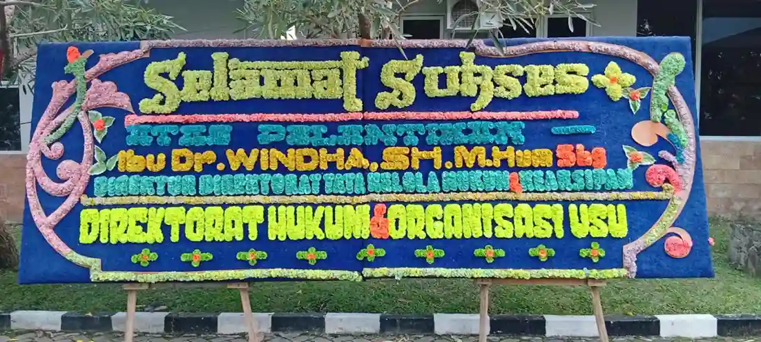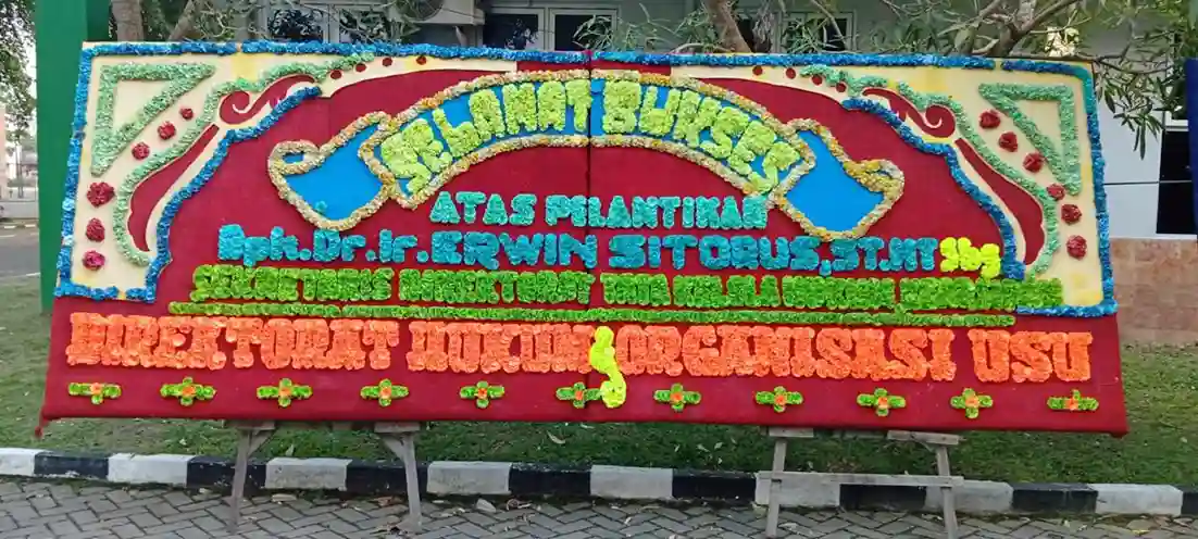 Karangan bunga papan gandeng ini dirangkai sesuai dengan model bunga papan di kota Medan sebagai ucapan selamat kepada seseorang atau lembaga atas suatu pencapaian.