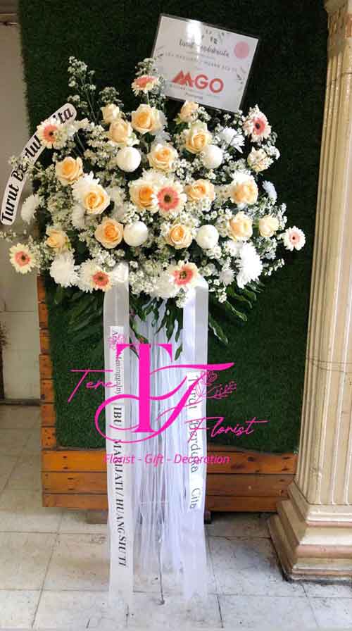 Dari atas ke bawah terbentang pita putih yang bertuliskan turut berdukacita dan nama pengirim karangan bunga tersebut. Dari atas kebawah juga terbentang kain tile halus warna putih. Rangkaian bunga ini dirangkai di atas penyangga besi yang kuat dan umumnya ditempatkan di dalam ruangan duka.